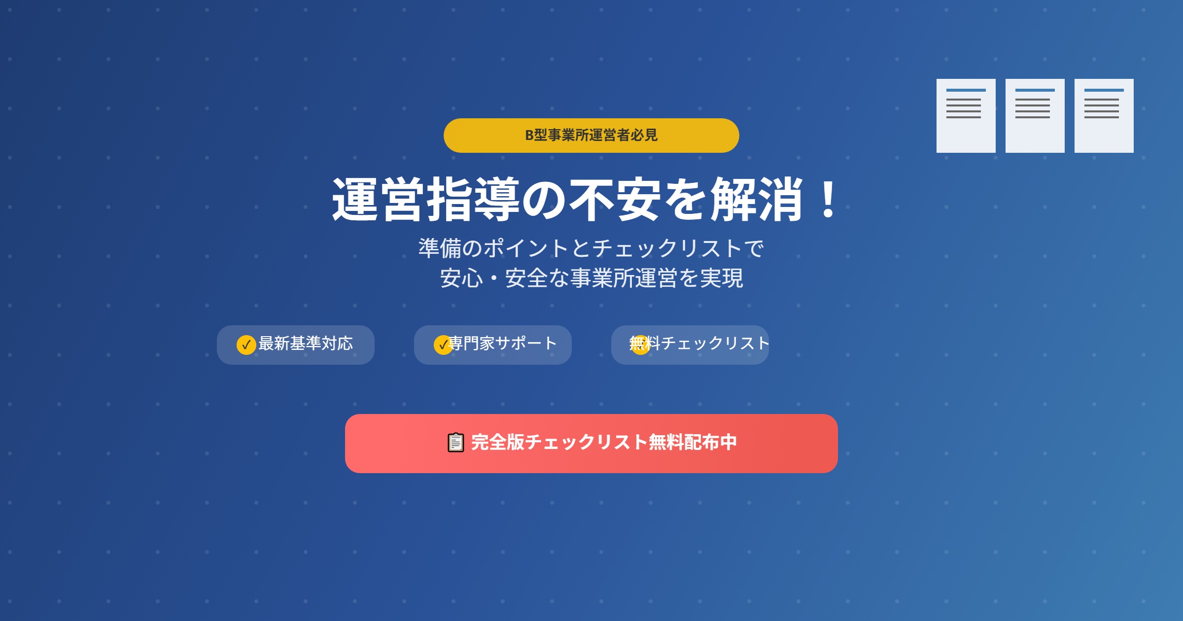 無料診断をはじめる → 【B型事業所向け】運営指導の不安を解消!準備のポイントとチェックリスト
