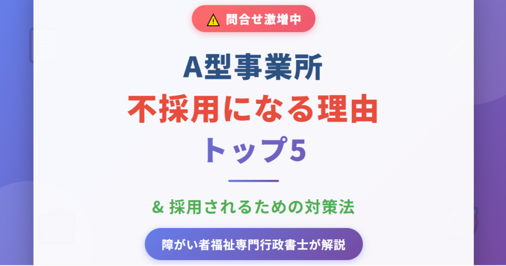 就労継続支援A型事業所への応募が増える中、残念ながら不採用となってしまうケースも少なくありません。A型事業所には定員が定められており、事業所側もより慎重に利用者の選定を行います。 障がい者福祉分野専門行政書士として、障がい者福祉事業所の元利... -